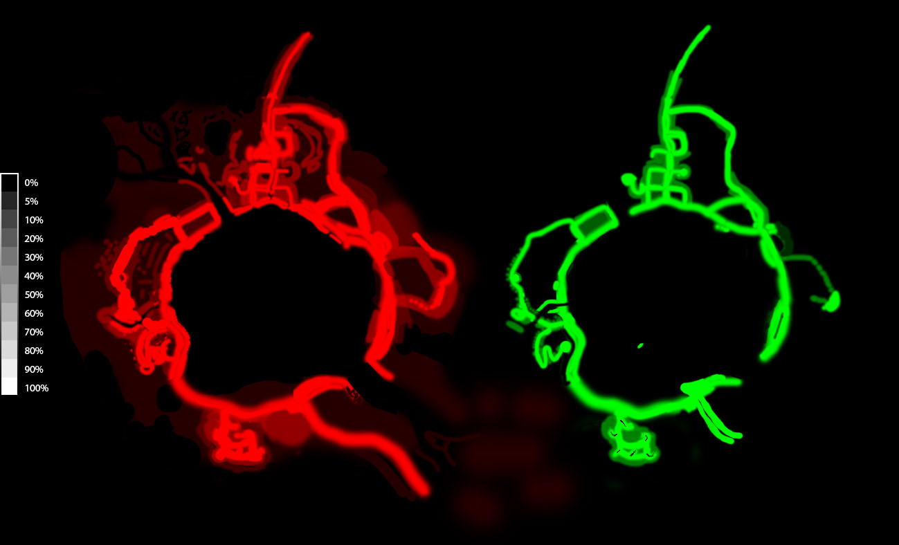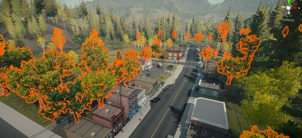 This prompted the creation of a “density map”, which allowed to specify the vegetation density at any point in the world. Vegetation spawning was tuned to represent the highest possible density, after which a 100% value was painted around the roads. 5% representing a base value, where only mature Douglas fir trees spawn, which was mostly used to cover the terrain areas visible in the distance. Some vegetation items only spawned if the density was 50% or higher. Grass being one of them, this only spawns around roads or otherwise easily accessible areas.