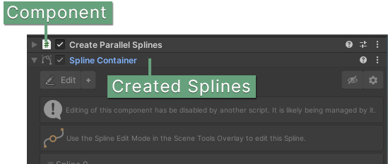 The component creates a new Spline Container, to store its output in. It will appear grayed out, to avoid accidentally manual changes (which would be overwritten again)