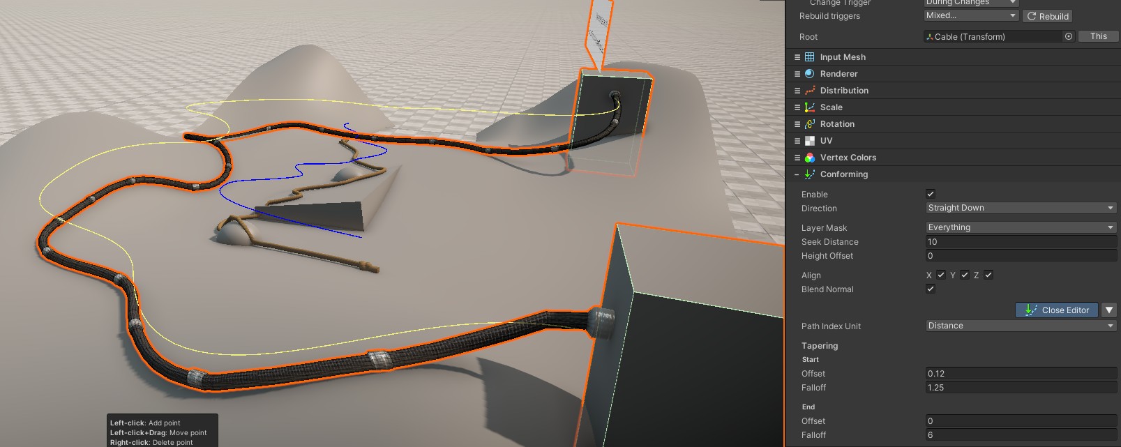 The conforming feature projects the Spline curve onto colliders in the scene. This feature also has a point-editor tool to offer fine control.