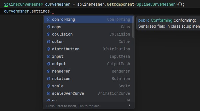 Both the Spline Curve Mesher and Spline Fill Mesher components have a settings class instance, which in turn has various sub-class instances (eg. Distribution, Scale, Collider etc). They are laid out almost identically to how they’re presented in the inspector UI, so specific settings are straightforward to find.