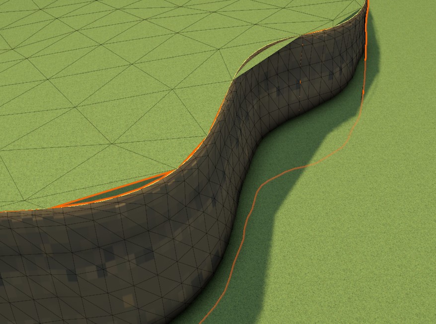 There is a lot of creative control over the height of the vertices. Each vertex knows its distance to the spline curve, allowing for a gradual falloff