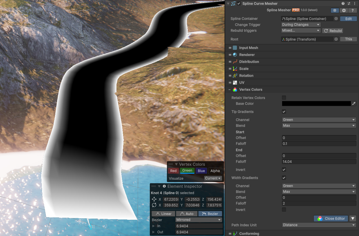 A gradient can be baked into the mesh along the length of the spline and over the width of the mesh. This is to speed up the process of making rivers, tire tracks or path decals.