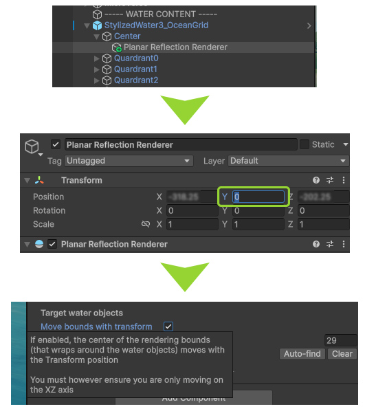When using an Ocean the reflections stop rendering after a while This is because the Ocean component has water mesh that move to follow the camera. Eventually they will travel outside of the bounds of the To remedy this: make the This ensures that the reflection renderer adapts to the moving ocean mesh segments (that follow the camera).Planar Reflection Renderer.Planar Reflection Renderer object a child of the ocean’s moving “Center” child object. Then check the “Move bounds with transform” option.