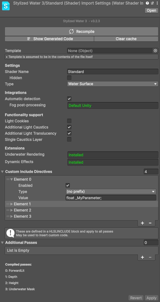 When selecting the shader file (Stylized Water 3/Shaders/StylizedWater3_Standard.watershader3) several options are exposed in the inspector.